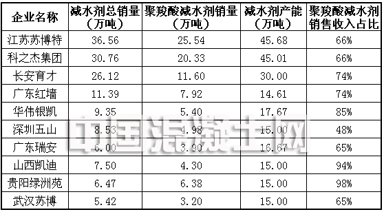 在此次上榜企業(yè)中,江蘇蘇博特再度蟬聯(lián)榜首,公司2015年銷量收入(不含稅,下同)13.11億元,同比前一年的17.15億元下滑23.56%。亞軍 和季軍的獲得者分別是科之杰集團(tuán)和長安育才。其中,建研集團(tuán)旗下外加劑事業(yè)部(科之杰新材料集團(tuán))2015年受下游需求低迷及產(chǎn)品價(jià)格下跌等影響,外加劑 新材料業(yè)務(wù)實(shí)現(xiàn)銷售收入9.11億元,較上年同比下滑29.54%。長安育才2015年聚羧酸減水劑銷售收入占公司總銷售收入的74%,公司去年實(shí)現(xiàn)銷售 收入5.21億元,同比下滑25.25%。廣東紅墻、華偉銀凱和深圳五山分列本次評(píng)選的第四至六名。