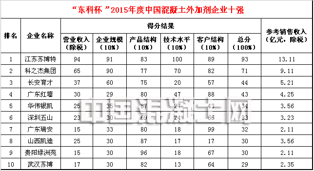 混凝土外加劑企業(yè)綜合十強(qiáng)評(píng)選是以2015年各企業(yè)實(shí)際銷售額為依據(jù),數(shù)據(jù)主要來自各外加劑企業(yè)上報(bào)、企業(yè)年報(bào)以及政府審計(jì)報(bào)告。部分企業(yè)因數(shù)據(jù)提供不完 整、不及時(shí),暫未被列入其中,望相關(guān)企業(yè)在下次評(píng)選中積極踴躍參與,共同推動(dòng)外加劑行業(yè)的繁榮與發(fā)展。由于時(shí)間有限,本次評(píng)選難免有所疏忽,若其中數(shù)據(jù)有 所偏差,請(qǐng)聯(lián)系我們!