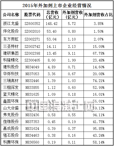 目前,我國外加劑上市企業(yè)2015年?duì)I業(yè)收入超過10億元的企業(yè)有浙江龍盛、傳化股份、東方雨虹、三圣特材和建研集團(tuán),五家企業(yè)的外加劑營收占比分別是 3.85%、1.50%、2.07%、15.09%和67.78%??偁I收超過2億元的企業(yè)有包括浙江龍盛、傳化股份、東方雨虹、三圣特材、建研集團(tuán)、科 隆精化、建科股份和華爍科技,共八家企業(yè)。另外,江蘇蘇博特及廣東紅墻也將分別赴上交所及深交所上市,目前江蘇蘇博特已報(bào)會(huì)(附:公司招股說明書),廣東紅墻已過會(huì)(附:公司招股說明書)。 (下表中佳維股份2015年1-9月營業(yè)收入2485.54萬元,因企業(yè)2015年年報(bào)完整版還未公布,2015年企業(yè)營收暫定為0.45億元。)盡管過 去的一年中我國整體經(jīng)濟(jì)增速放緩,但隨著近年來我國基建、地產(chǎn)行業(yè)的持續(xù)復(fù)蘇,各企業(yè)的外加劑產(chǎn)能不斷擴(kuò)大,外加劑銷量及營收占比也呈攀升態(tài)勢(shì)。