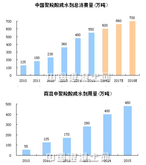 自2013年我國聚羧酸減水劑需求量首次超過萘系等二代減水劑以來,目前聚羧酸減水劑已成為減水劑市場的主流產(chǎn)品,應(yīng)用領(lǐng)域和需求總量不斷擴大,2015 年中國聚羧酸減水劑總消費量達550萬噸,同比前一年的480萬噸增長14.58%。其中商混用聚羧酸減水劑消費量達480萬噸,同比前一年增長20%。 總體而言,我國對于聚羧酸減水劑的市場需求量整體呈攀升態(tài)勢。但受困于國內(nèi)經(jīng)濟下行、終端市場不景氣,上游去產(chǎn)能等不利因素的影響,聚羧酸減水劑企業(yè)在過 去的2015年日子并不好過,在上榜的十強企業(yè)中,有半數(shù)企業(yè)2015年聚羧酸減水劑銷量都有所下滑。