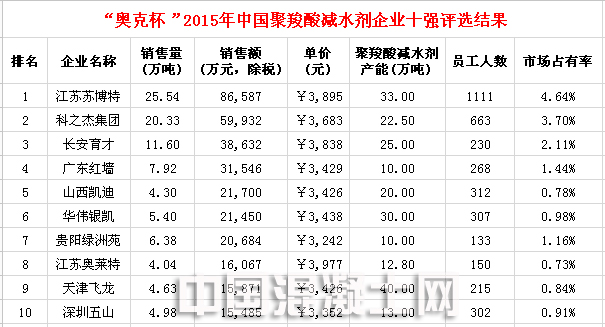2015年中國聚羧酸減水劑企業(yè)十強以2015年各企業(yè)聚羧酸系減水劑實際銷售收入為依據(jù),數(shù)據(jù)主要來源為各外加劑企業(yè)自報、上市企業(yè)年報以及工商年審資料等。部分企業(yè)因數(shù)據(jù)提供不完整、不及時,暫未被列入其中。望相關(guān)企業(yè)在下次評選中積極踴躍參與,共同推動外加劑行業(yè)的繁榮與發(fā)展。由于時間有限,本次評選難免有所疏忽,若其中數(shù)據(jù)有所偏差,請聯(lián)系我們!