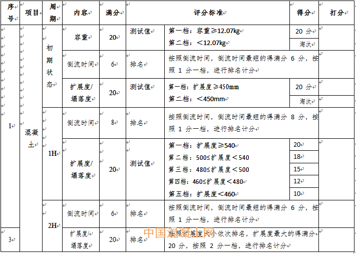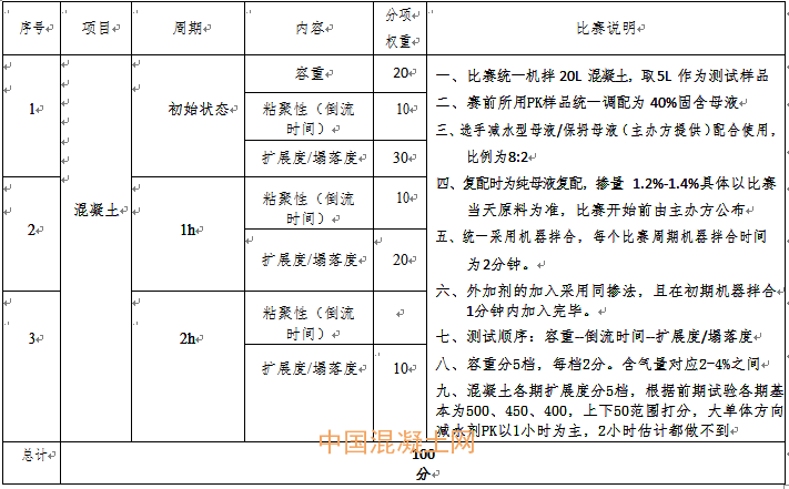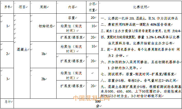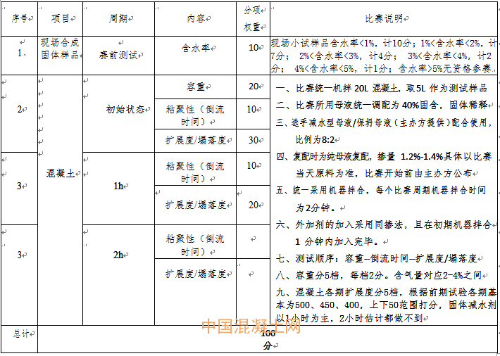 新拌混凝土試驗(yàn)次序,選手抽簽決定,現(xiàn)場(chǎng)不公布,只有參賽選手自己知道,增加活動(dòng)公平性和娛樂(lè)性。 最總裁決各方向擂主由專家委員會(huì)、奧克股份、中國(guó)混凝土網(wǎng)和易貿(mào)代表根據(jù)現(xiàn)場(chǎng)實(shí)際打分情況,以事實(shí)為根據(jù)共同商議裁決,并當(dāng)場(chǎng)公布頒獎(jiǎng)。 本次賽事的3個(gè)方向主裁判分別為: 王子明(固體方向),孫振平(大單體方向),劉松柏(小單體方向) 裁判工作: (1)現(xiàn)場(chǎng)檢查摻量、配合比、混凝土容重、倒流時(shí)間、擴(kuò)展度/塌落度,并現(xiàn)場(chǎng)記錄,便于評(píng)分 (2)檢查所稱物料在規(guī)定的精度范圍內(nèi),參照附表:精度表1-2 (3)檢查加料方法是否符合大賽規(guī)則 (4)留樣并檢驗(yàn)外加劑含固量及其它對(duì)比賽結(jié)果產(chǎn)生影響的規(guī)定外的成分 (5)對(duì)現(xiàn)場(chǎng)測(cè)試和評(píng)分過(guò)程中出現(xiàn)的爭(zhēng)議進(jìn)行協(xié)調(diào)裁決 7、違規(guī)處理 出現(xiàn)下述情況,成績(jī)無(wú)效: